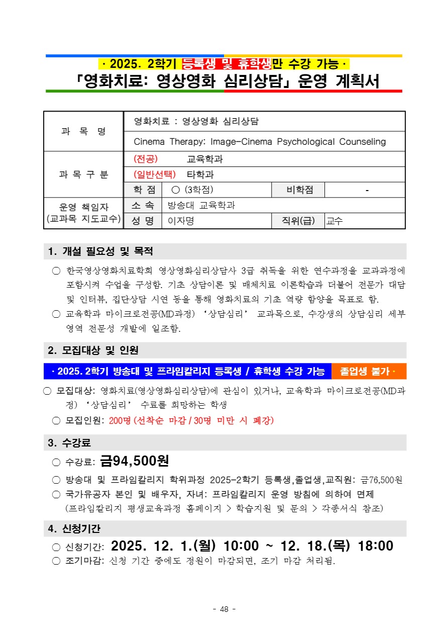 신청조건: 2025. 2학기 등록생 및 휴학생 한정 수강 가능 (졸업생 불가)