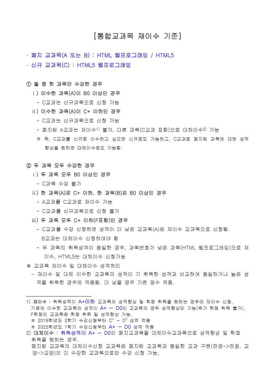 * 첨부된 '동일인정교과목(통합교과) 재이수 기준' 파일에서 [재이수] 및 [대체이수] 취득성적 기준이 2025년도부터 변경 되었으므로 확인 부탁드립니다.