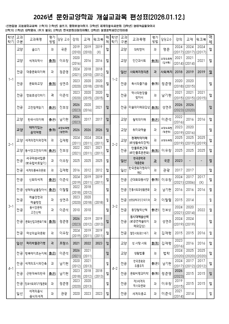 2026학년도 1학기 문화교양학과 개설 교과목 편성표를 안내해 드립니다.