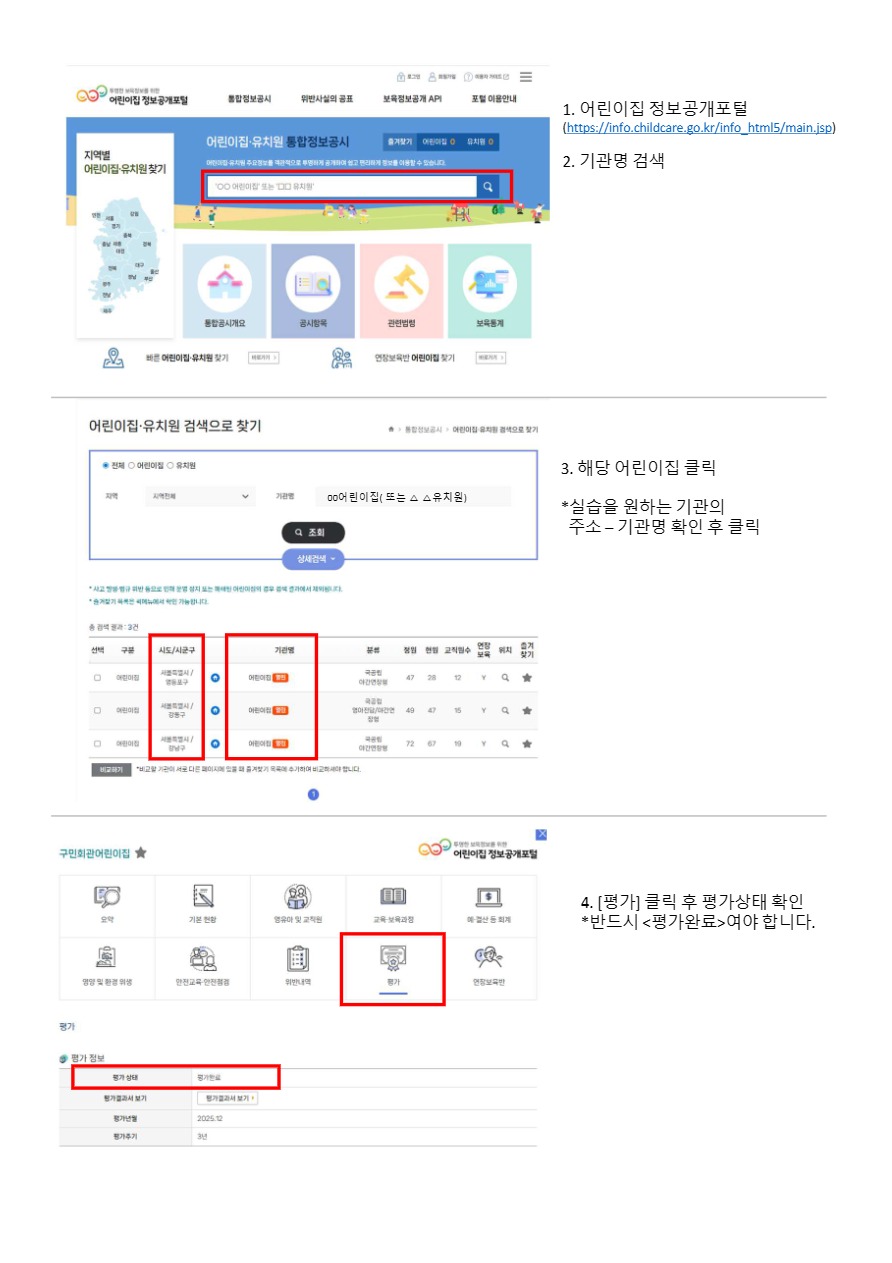 반드시 실습 시작 당일에 어린이집 및 통합정보공시를 통해 평가상태를 확인한 후 실습을 진행하여주시기 바랍니다.