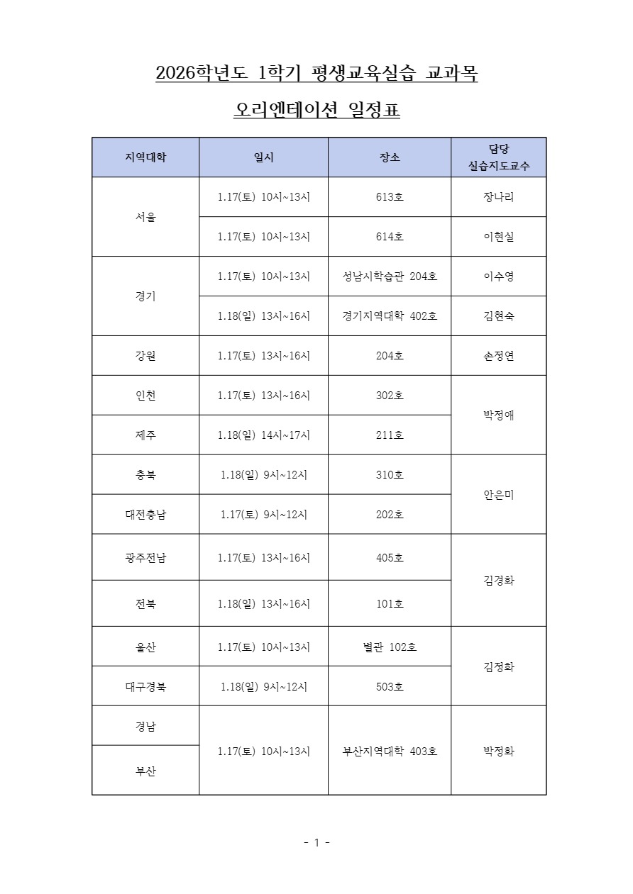 2026학년도 1학기 평생교육실습 교과목 오리엔테이션 일정 공지해드립니다.