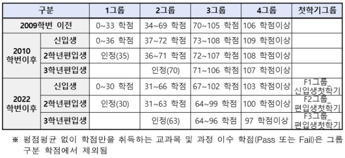 | 학과 | 그룹 | 구분 | 평점평균 | 실점평균 | 이수학점 |