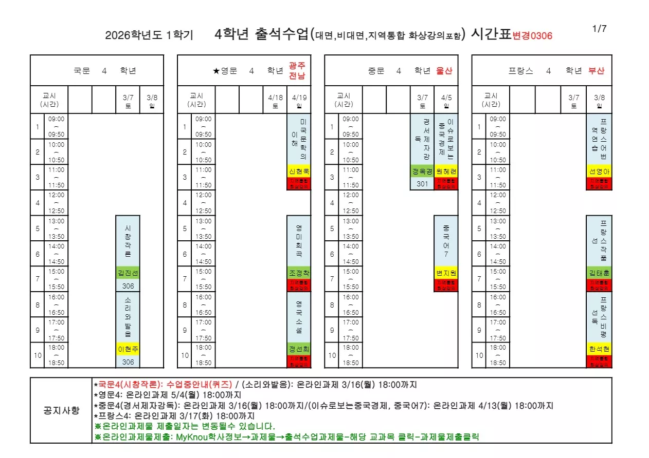 - (4학년) 2026. 1학기 출석수업 시간표_변경0306.pdf 미리보기