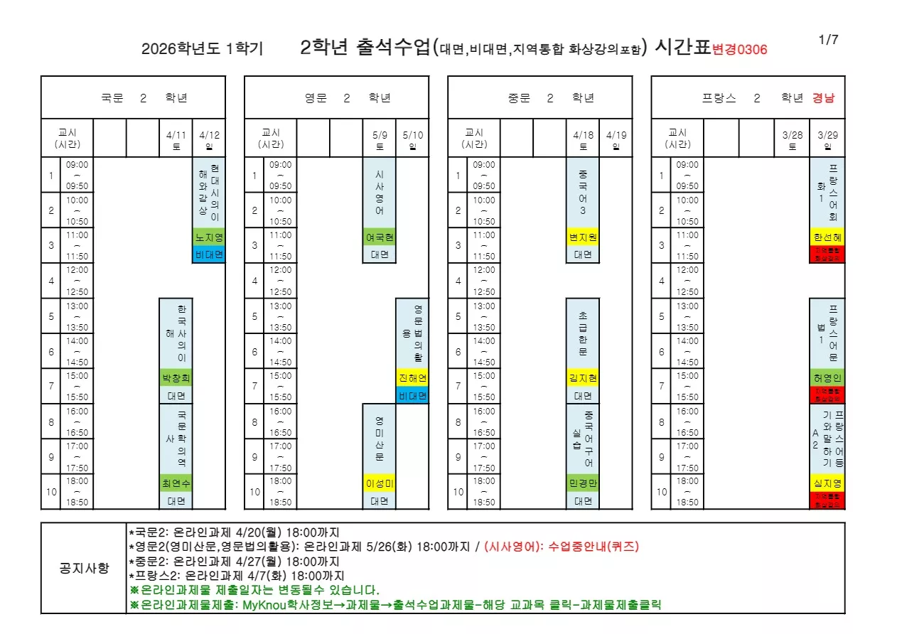 ⬇ (1학년) 2026. 1학기 출석수업 시간표_변경0306.pdf