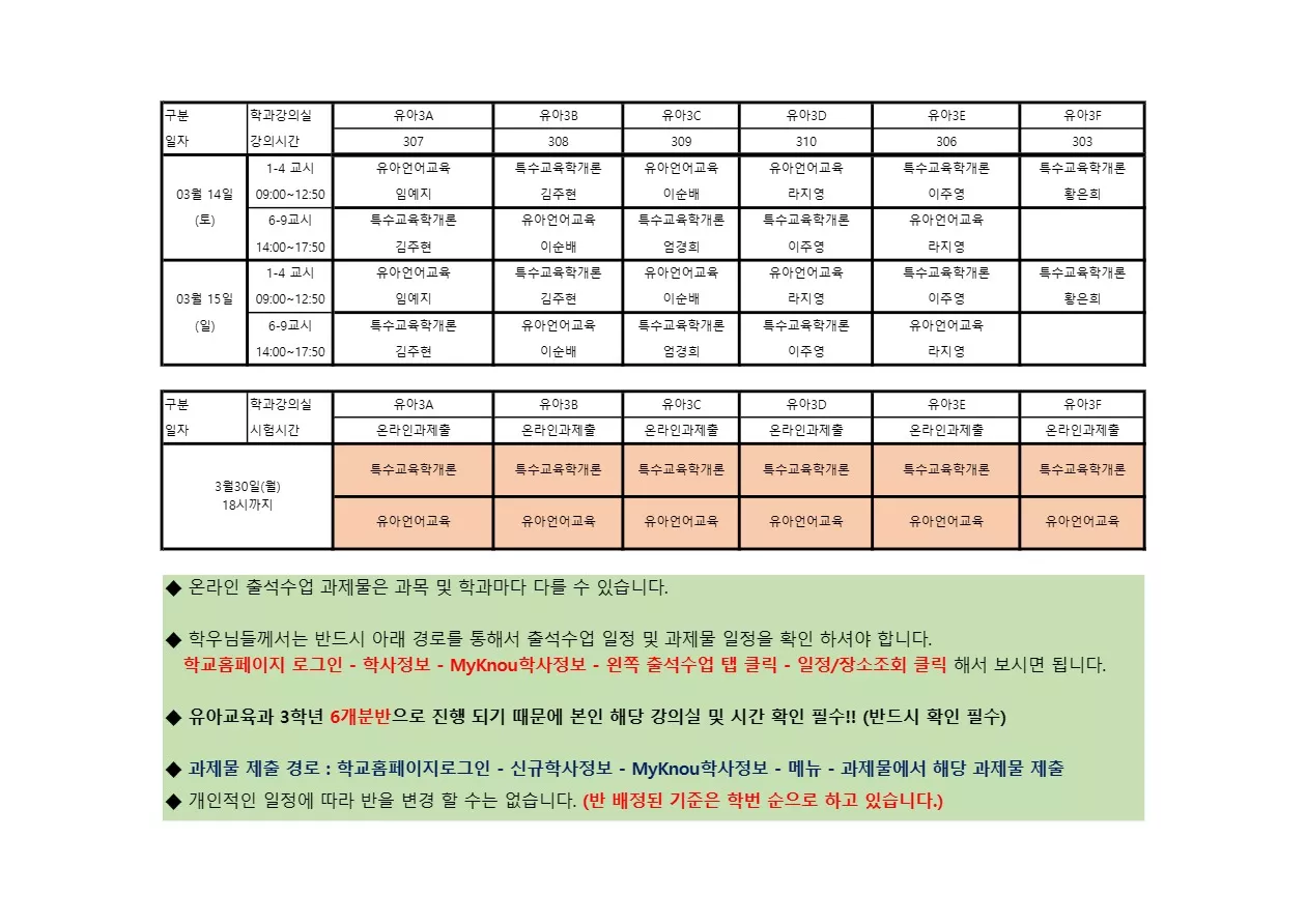 [세부시간표] 대전충남지역대학 출석수업 3월 2주차(3/14-3/15)