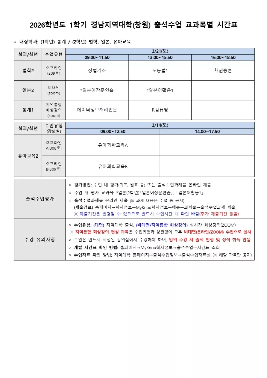 [창원] 2026학년도 1학기 출석수업 교과목별 시간표(3.21.~3.22.).pdf 미리보기