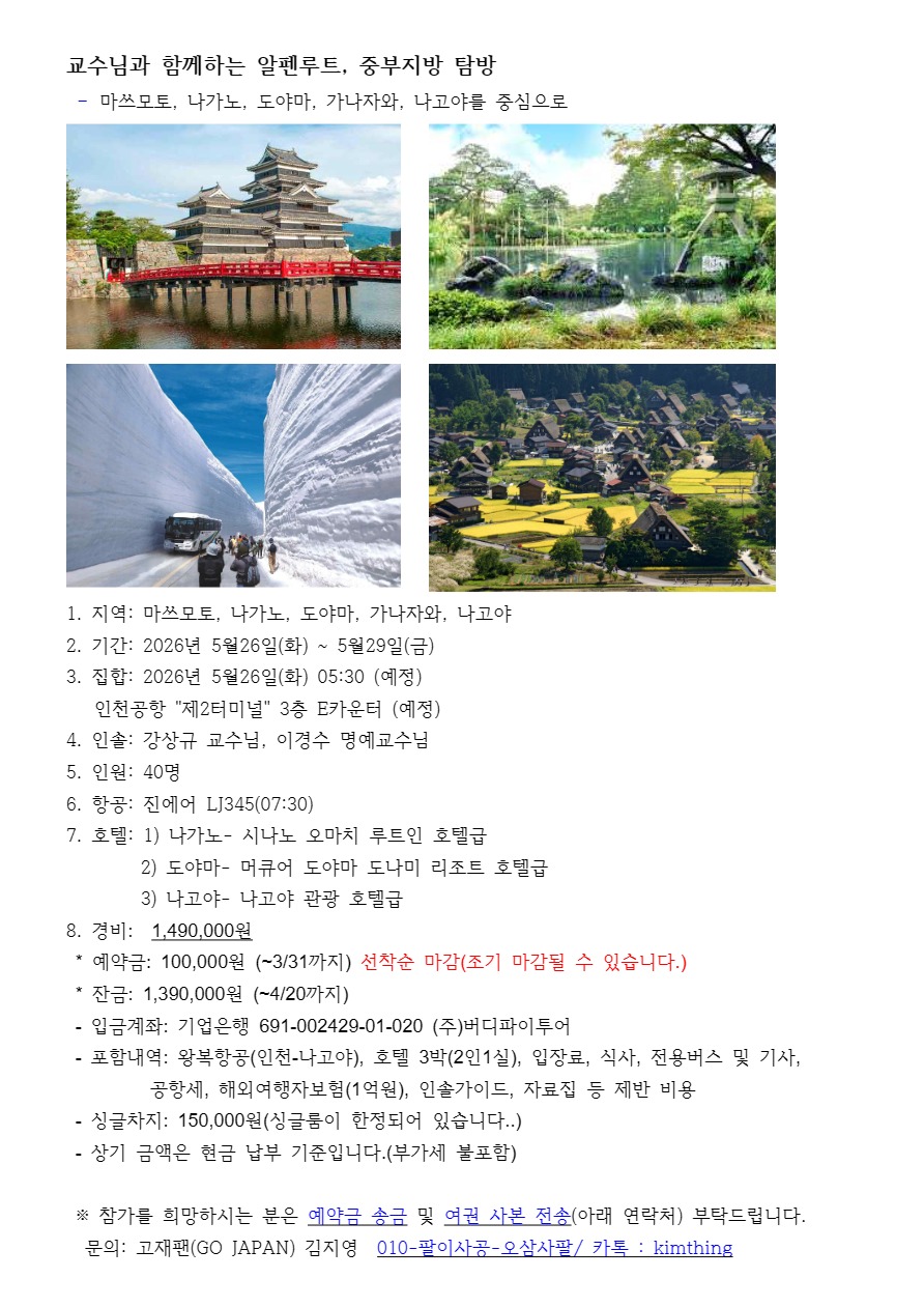 2026년 봄학기를 맞이하여 <교수님과 함께 하는 알펜루트중부지방 탐방>이 다음과 같이 진행됩니다일본 북알프스의 웅장한 대자연의 절경을 체험하는 다테야마 구로베 알펜루트일본 3대 정원 중의 하나로 에도시대 회유 임천식 정원의 특징이 잘 남아 있는 겐로쿠엔마츠모토 출신의 세계적인 아티스트 쿠사마 야요이의 마쓰모토시 미술관유네스코 세계유산으로 지정된 합장촌 마을 시라카와고, 전통 갓쇼즈쿠리 가옥 26동을 이축하여 보존한 야외 박물관 민가원 등 역사와 문화는 물론멋진 자연을 만끽할 수 있습니다교수님과 재학생 및 동문이 함께 하는 소중한 추억 여행에 관심 있는 분들의 많은 참여 바랍니다.