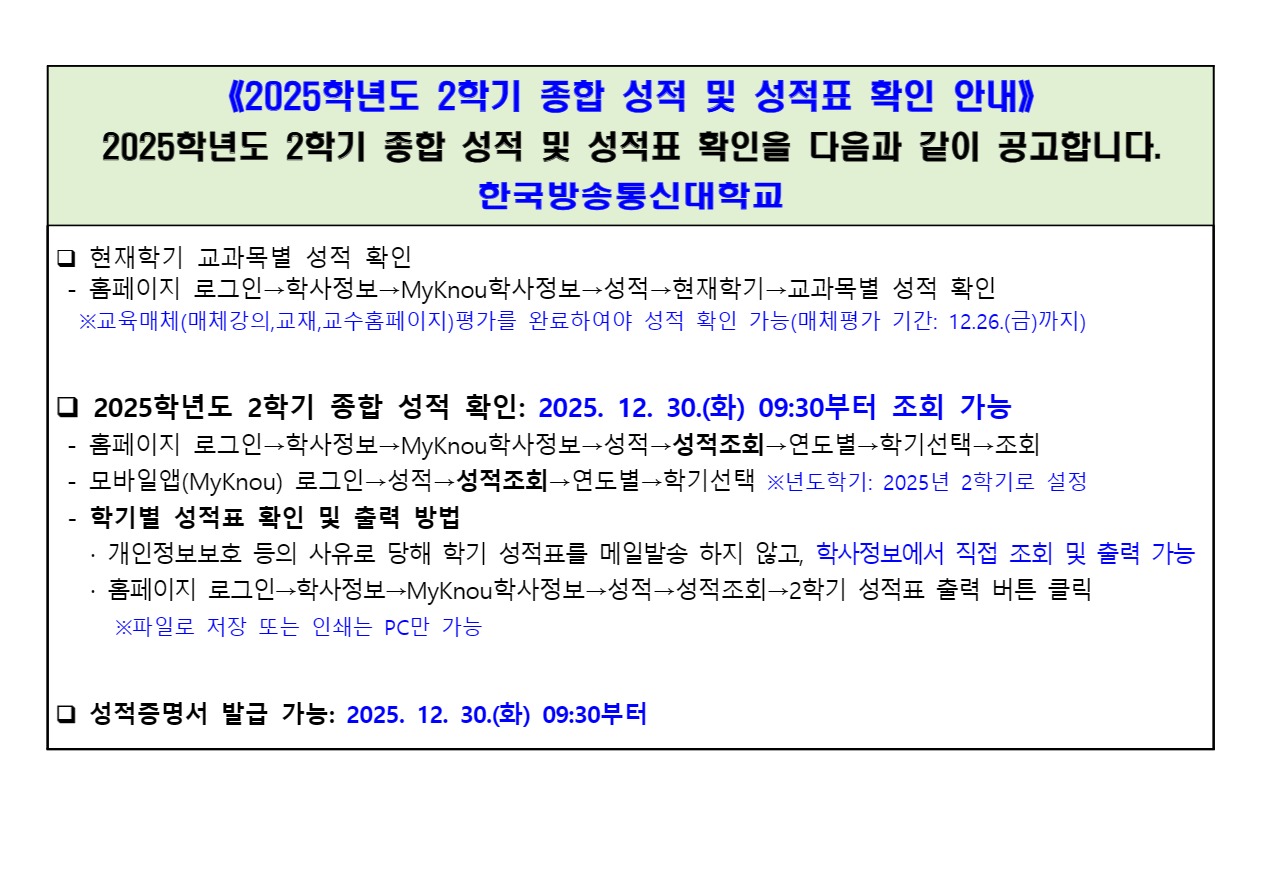 ⬇ https://www.knou.ac.kr/bbs/knou/51/777422/artclView.do?layout=unknown 2025학년도 2학기 종합 성적 및 성적표 확인 안내 고등교육의 기회 제공, 국민교육의 수준 향상, 사회교육의 확대 발전, 분야별 인재양성 from WWW.KNOU.AC.KR ⬇ 2025.2학기 종합 성적 및 성적표 확인 안내문.pdf Love 2 삭제요청 삭제요청 Scrap 스크랩