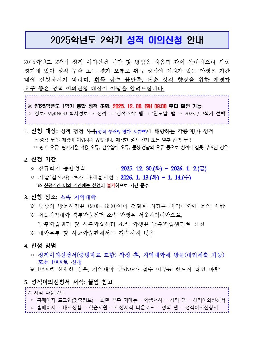 ⬇ https://www.knou.ac.kr/bbs/knou/51/777704/artclView.do?layout=unknown 2025학년도 2학기 성적이의신청 안내 고등교육의 기회 제공, 국민교육의 수준 향상, 사회교육의 확대 발전, 분야별 인재양성 from WWW.KNOU.AC.KR 2025학년도 2학기 성적 이의신청 안내(공지용)-국내.hwp 미리보기 Love 0 삭제요청 삭제요청 Scrap 스크랩