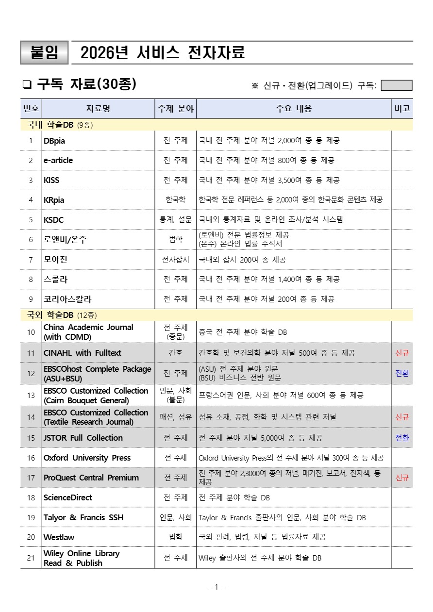(신규ㆍ전환 구독 5종: CINAHL with Fulltext, EBSCOhost Complete Package(ASU+BSU), Textile Research Journal, JSTOR Full Collection, ProQuest Central Premium)