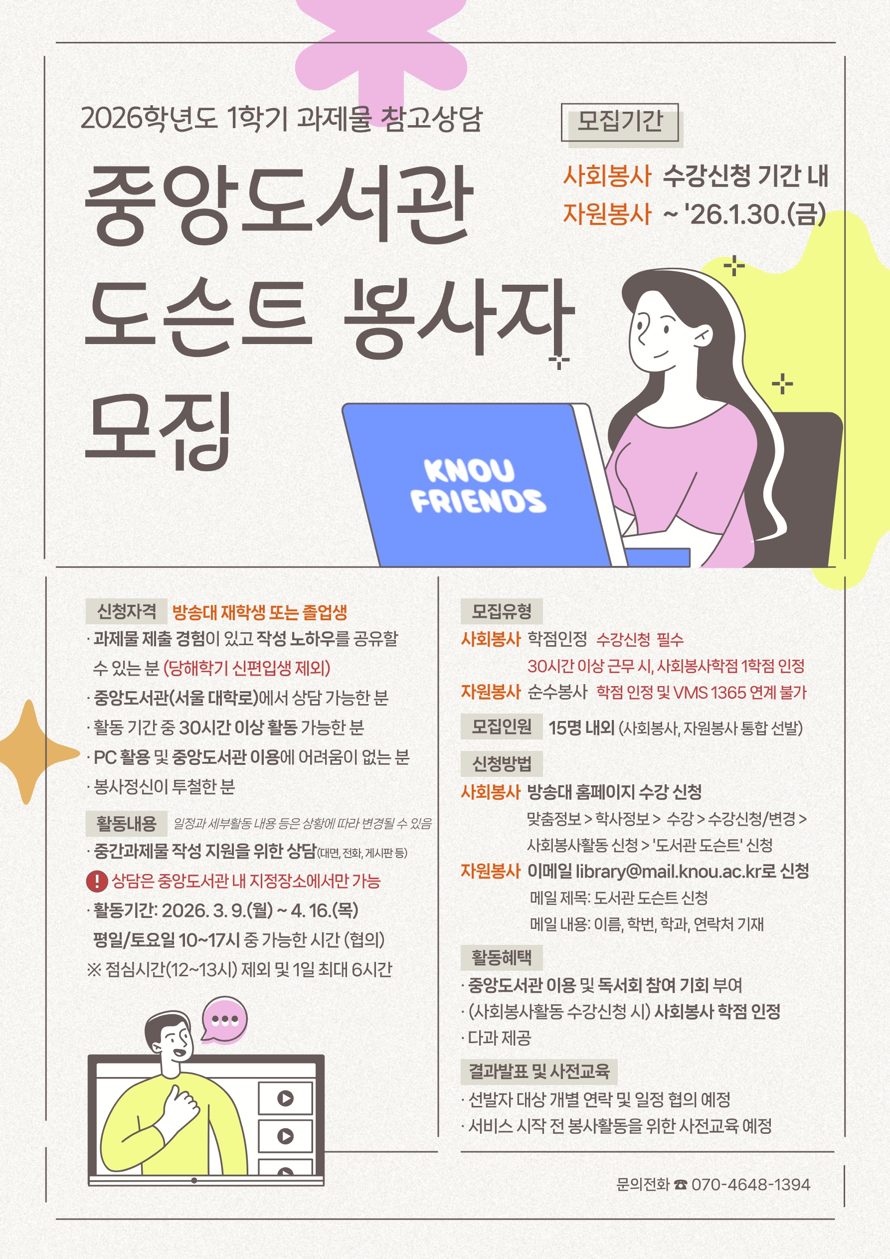 ⬇ https://www.knou.ac.kr/bbs/knou/51/779953/artclView.do?layout=unknown 2026학년도 1학기 중앙도서관 도슨트 봉사자 모집 안내 고등교육의 기회 제공, 국민교육의 수준 향상, 사회교육의 확대 발전, 분야별 인재양성 from WWW.KNOU.AC.KR ⬇ 도슨트 봉사활동자 모집 공고(2026.1.).pdf Love 1 삭제요청 삭제요청 Scrap 스크랩