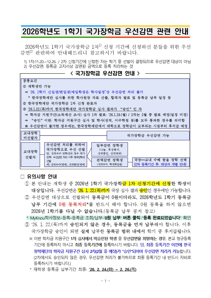 ⬇ https://www.knou.ac.kr/bbs/knou/51/781306/artclView.do?layout=unknown 2026학년도 1학기 국가장학금 우선감면 관련 안내 고등교육의 기회 제공, 국민교육의 수준 향상, 사회교육의 확대 발전, 분야별 인재양성 from WWW.KNOU.AC.KR ⬇ 2026학년도 1학기 국가장학 우선감면 안내(공지).pdf Love 2 삭제요청 삭제요청 Scrap 스크랩