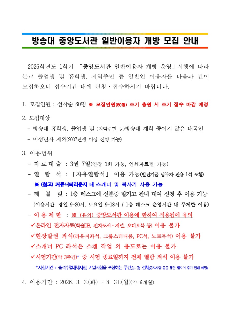 [중앙도서관] 26_1학기 일반이용자 모집 안내