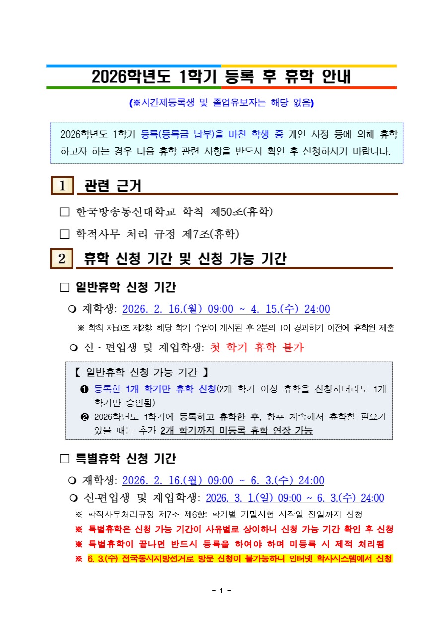 ⬇ https://www.knou.ac.kr/bbs/knou/51/783766/artclView.do?layout=unknown 2026학년도 1학기 등록 후 휴학 안내 고등교육의 기회 제공, 국민교육의 수준 향상, 사회교육의 확대 발전, 분야별 인재양성 from WWW.KNOU.AC.KR 2026학년도 1학기 등록 후 휴학 안내.pdf 미리보기 Love 4 삭제요청 삭제요청 Scrap 스크랩