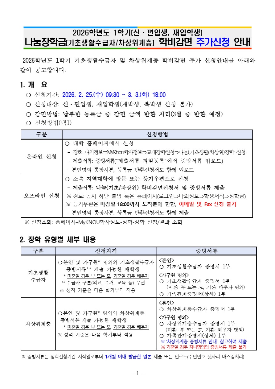 26-1학기 각종 시험 결시사유 인정범위 변경 내용 공지