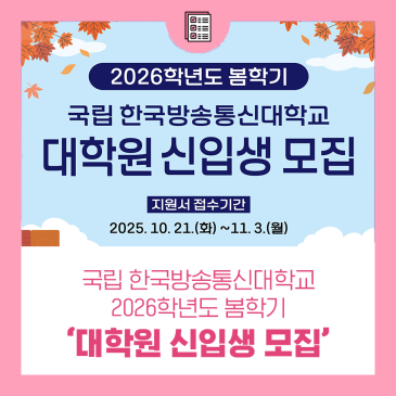 » 국립 한국방송통신대학교, 2026학년도 봄학기 대학원 신입생 모집 newfile 66 0 2025.10.07