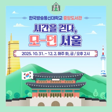 안녕하세요. 국립 한국방송통신대학교입니다. 방송대 중앙도서관 문화행사 "시간을 걷다, 모-던 서울"이 10월 31일부터 12월 2일까지 운영합니다! 서울의 옛 시간을 따라 걸으며 식민과 분단, 이산의 아픈 기억을 되짚어 보는 시간. 방송대와 같이 떠나볼까요? 시간을 걷다, 모-던 서울 운영기간 2025. 10. 31. (금) ~ 12. 2.(화) 총 10회, 매주 화/금 참여대상 재학생 및 지역주민 등 30명 신청기간 2025. 10. 13. (월) 09:00 ~ 마감 시 강연주제 서울의 근대적 시간을 따라 걸으며 식민과 분단, 이산의 기억을 되짚어 보는 시간 운영장소 방송대 대학본부 국제회의장 3층 및 탐방 장소.......