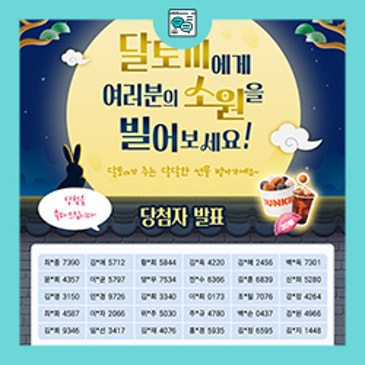 추석맞이 달토끼에게 소원 빌기 이벤트 당첨자를 발표합니다 푸짐한 선물의 주인공이 되신 분들은 누구일까요? 아래 이미지에서 확인해 주세요! 당첨된 여러분들 모두 축하드립니다!✨✨ 당첨된 분들께는 참여시 제출하셨던 휴대폰 번호를 통해 경품을 발송해 드릴 예정입니다. 앞으로도 방송대 공식 SNS 많은 관심✨과 사랑❤️ 부탁드립니다! *당첨 경품은 개인정보 취합일로부터 14일 이내로 발송될 예정입니다. * 잘못된 개인정보 입력으로 인한 경품 누락 시 책임은 당첨자 본인에게 있습니다.