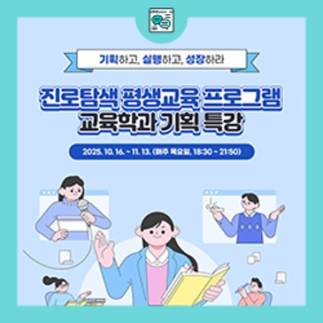 안녕하세요. 국립 한국방송통신대학교입니다. 기획하고, 실행하고, 성장하라 방송대 교육학과에서 진로탐색 평생교육 프로그램 기획 특강이 열립니다! 진로에 대해 고민하고 있는 방송대 학생이라면 지금 진로탐색 평생교육 프로그램 기획 특강을 들어보세요! ✏️강의 안내 ✏️강의 일정 ✏️주차별 주제 다양한 실습지도강사와의 유용하고 실용적인 특강, 방송대 진로탐색 평생교육 프로그램 기획 특강에 많은 관심과 참여 부탁드립니다.