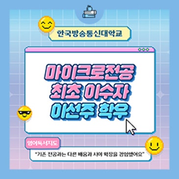 안녕하세요, 국립 한국방송통신대학교입니다. 방송대 마이크로전공 첫 이수자가 탄생했습니다! 경쟁력은 높게, 부담은 적게 지식은 깊게, 경험은 넓힐 수 있는 마이크로전공 최초 이수자 이선주 학우를 함께 만나볼까요? ↓출판문화원 인터뷰 https://weekly.knou.ac.kr/articles/view.do?artcUn=6026 2025년 1학기 첫 시행된 방송대 마이크로(MD)전공 제도 그 첫 번째 이수자 이선주 학우! 통게·데이터과학을 전공하며 영어독서지도(MD) 과정까지 완주해 새로운 시작을 했습니다. "지식을 쌓는 걸 넘어 나만의 스토리를 만드는 기회였어요! "전혀 다른 영역을 배우며 생각의 폭이 넓어지고 새로운 시각으로 세상을 보.......