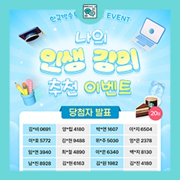 여러분이 사랑하는 강의를 소개하고 선물도 받아가는 나의 인생 강의 추천 이벤트 푸짐한 선물의 주인공이 되신 분들은 누구일까요? 아래 이미지에서 확인해 주세요! 당첨된 여러분들 모두 축하드립니다!✨✨ 당첨된 분들께는 참여시 제출하셨던 휴대폰 번호를 통해 경품을 발송해 드릴 예정입니다. 앞으로도 방송대 공식 SNS 많은 관심✨과 사랑❤️ 부탁드립니다! *당첨 경품은 개인정보 취합일로부터 14일 이내로 발송될 예정입니다. * 잘못된 개인정보 입력으로 인한 경품 누락 시 책임은 당첨자 본인에게 있습니다.