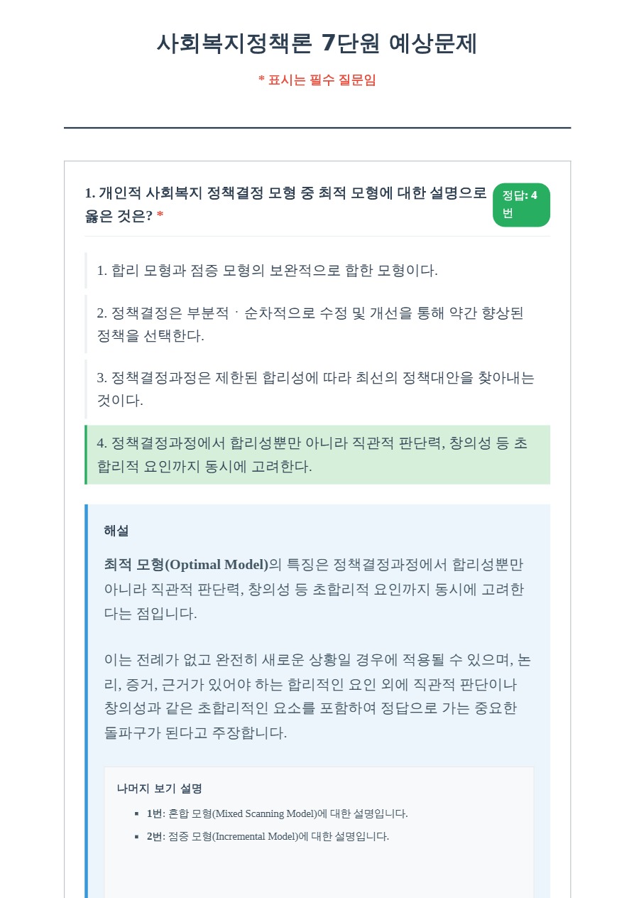 사회복지정책론 7 ⬇ 사회복지정책론 7장 예상문제 정답 해설.pdf 장 예상문제 & 정답 & 해설 21학번 선배님 자료에 정답과 해설이 없어서, 이를 추가 및 보완하여 더 보기 좋게 만들었습니다.