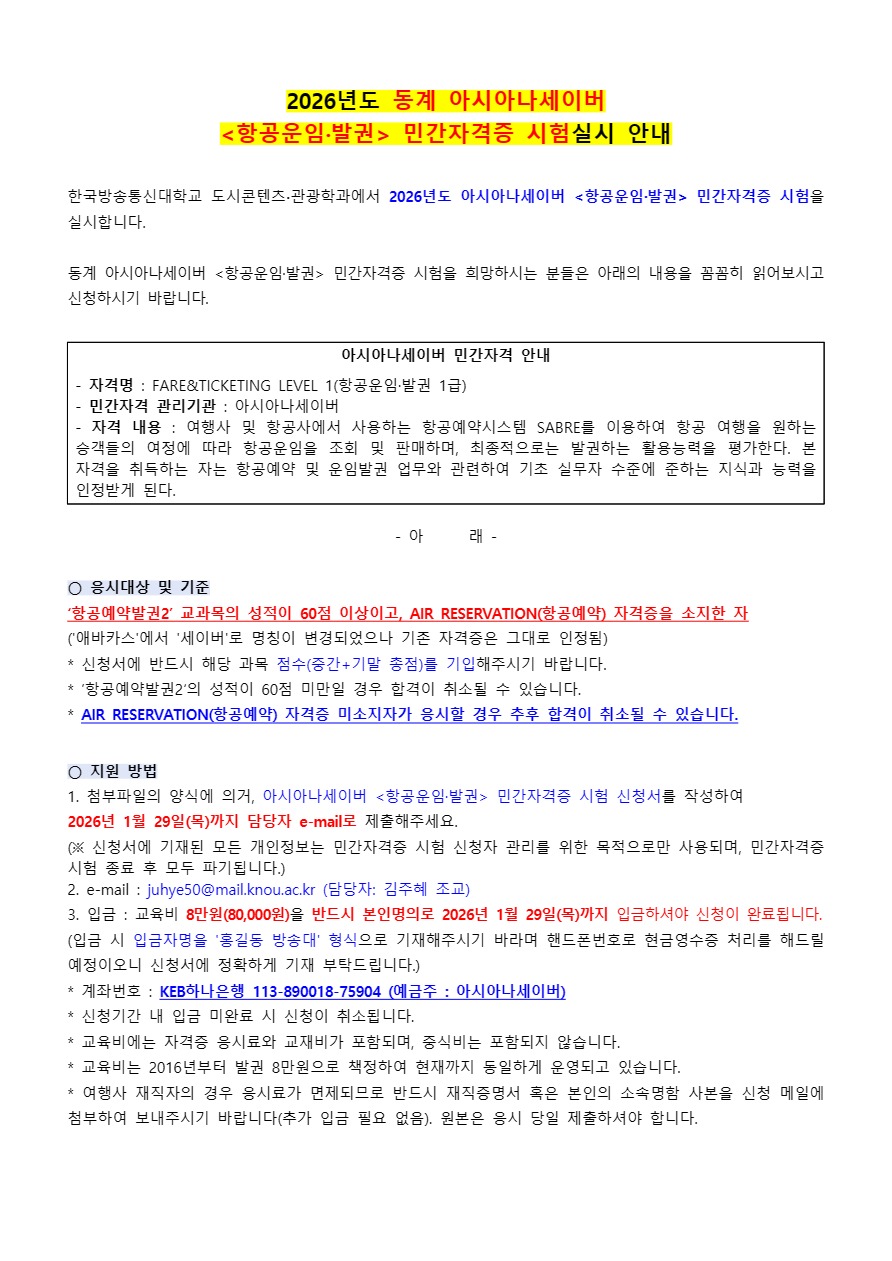 ⬇ https://tourism.knou.ac.kr/bbs/tourism/2109/777679/artclView.do?layout=unknown [양식]아시아나세이버 민간자격증 시험 신청서(항공운임·발권).hwp 미리보기 2026년도 동계 항공운임·발권 자격증 시험 실시 안내(도시콘텐츠·관광).pdf 미리보기 Love 2 삭제요청 삭제요청 Scrap 스크랩